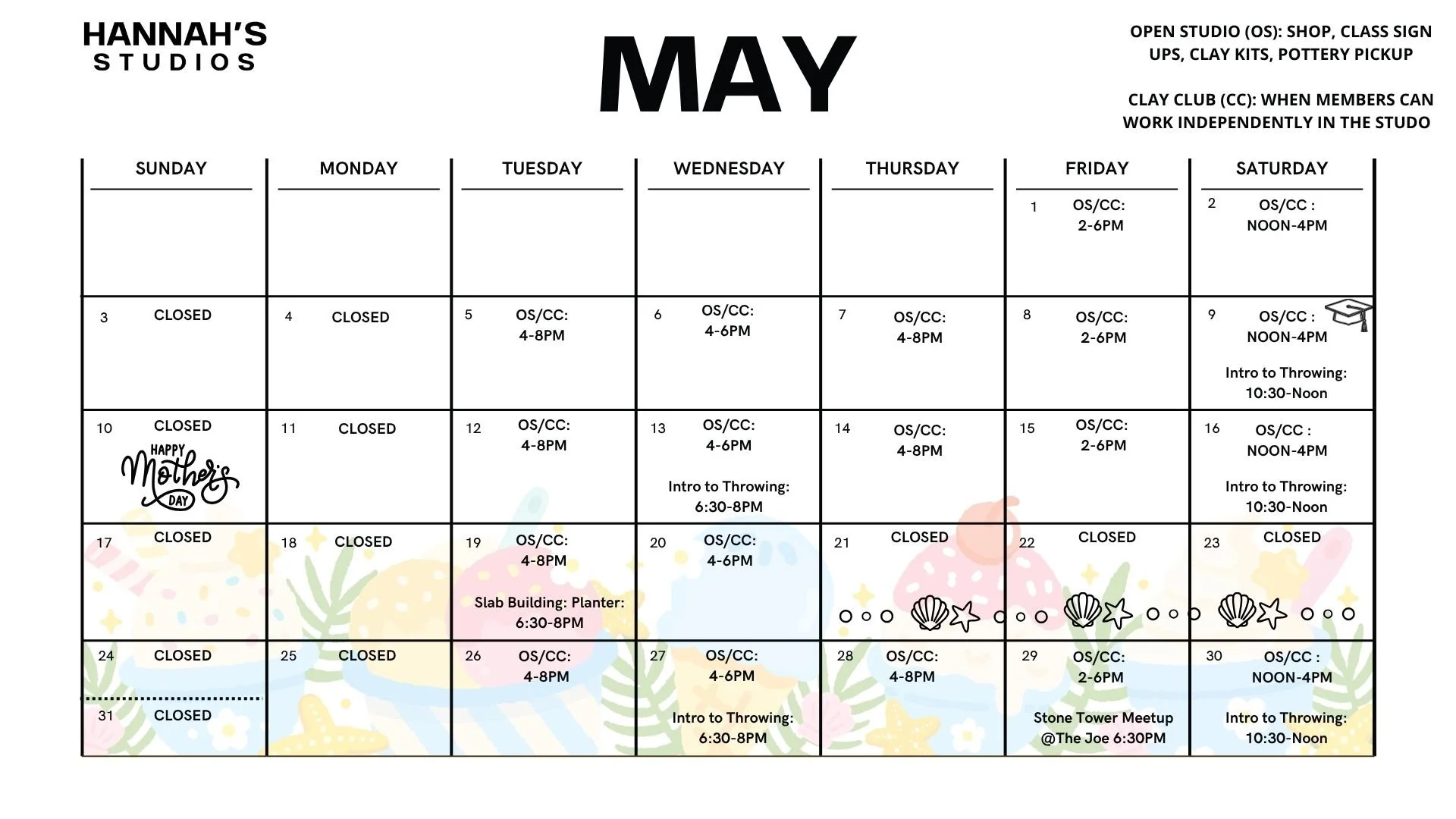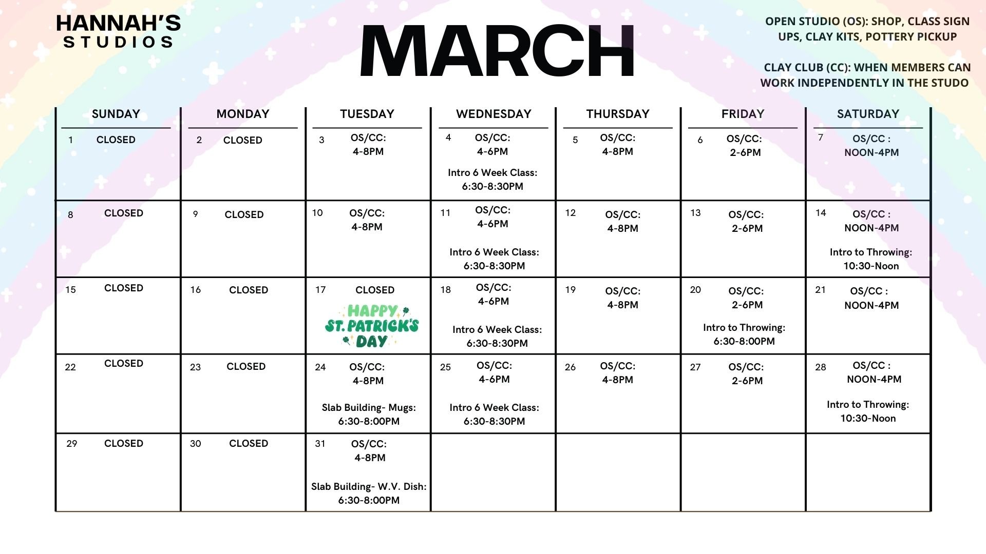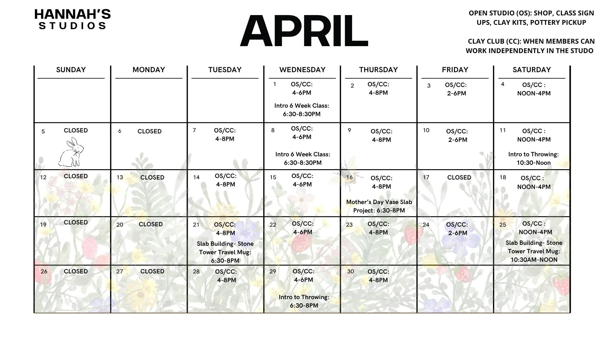 The best places to stay up-to-date on upcoming classes and the studio schedule are on Instagram and Facebook at @hannahsstudios